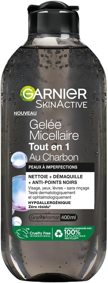 Garnier – Gelée Micellaire Tout en 1 au Charbon – Nettoie, Démaquille et Réduit les points noirs – Visage, Yeux et Lèvres – Peaux à Imperfections – 400 ml